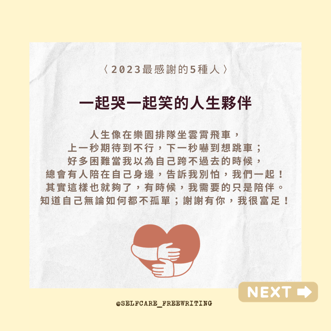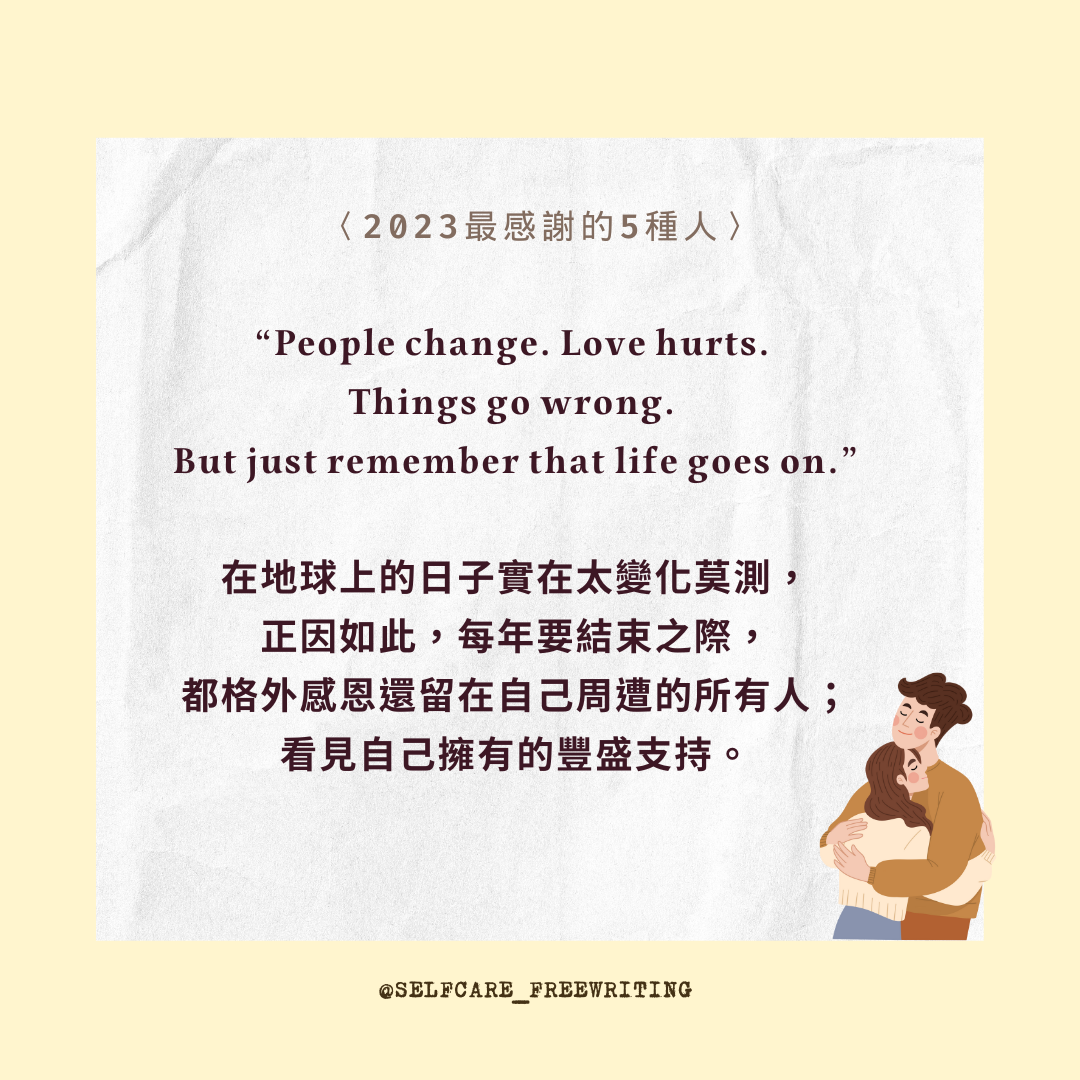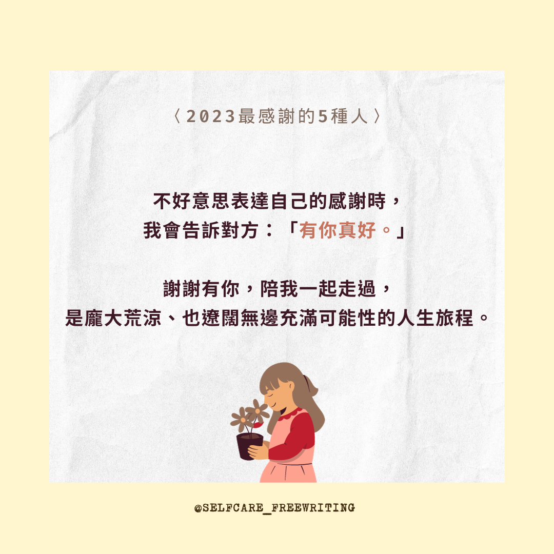 自我照顧方式 2023最感謝的5種人🍀 不好意思表達自己的感謝時,我會告訴對方:「有你真好。」 喜歡年末的其中一個理由,是能好好檢視、回顧這一年的所有。能夠感恩的時候,會感受到自己的豐盛與富足。不好意思表達自己的感謝時,我會告訴對方:「有你真好。」謝謝2023的這些人,陪我一起走過,龐大荒涼、但也遼闊無邊充滿可能性的人生旅程。