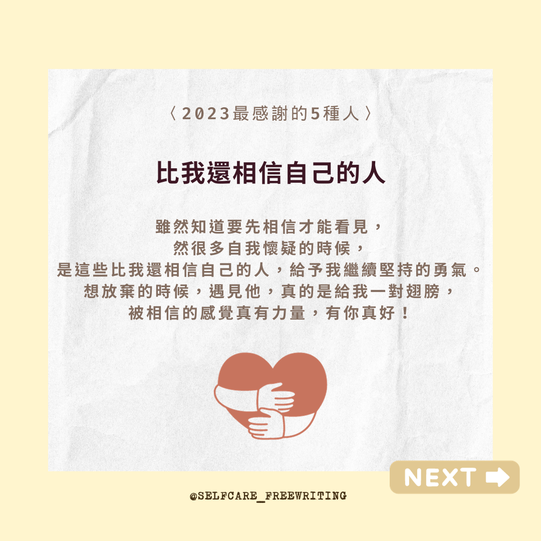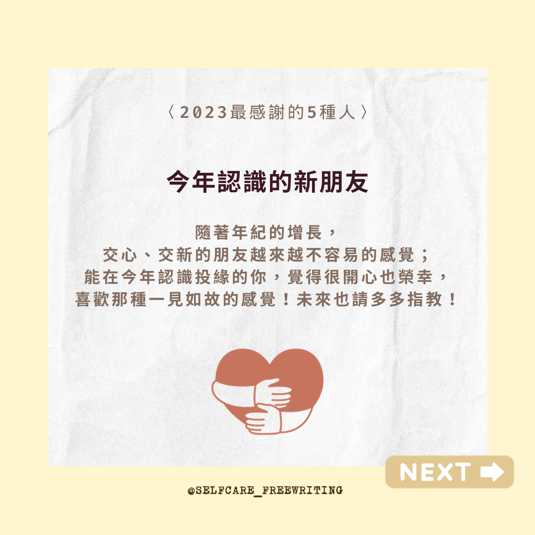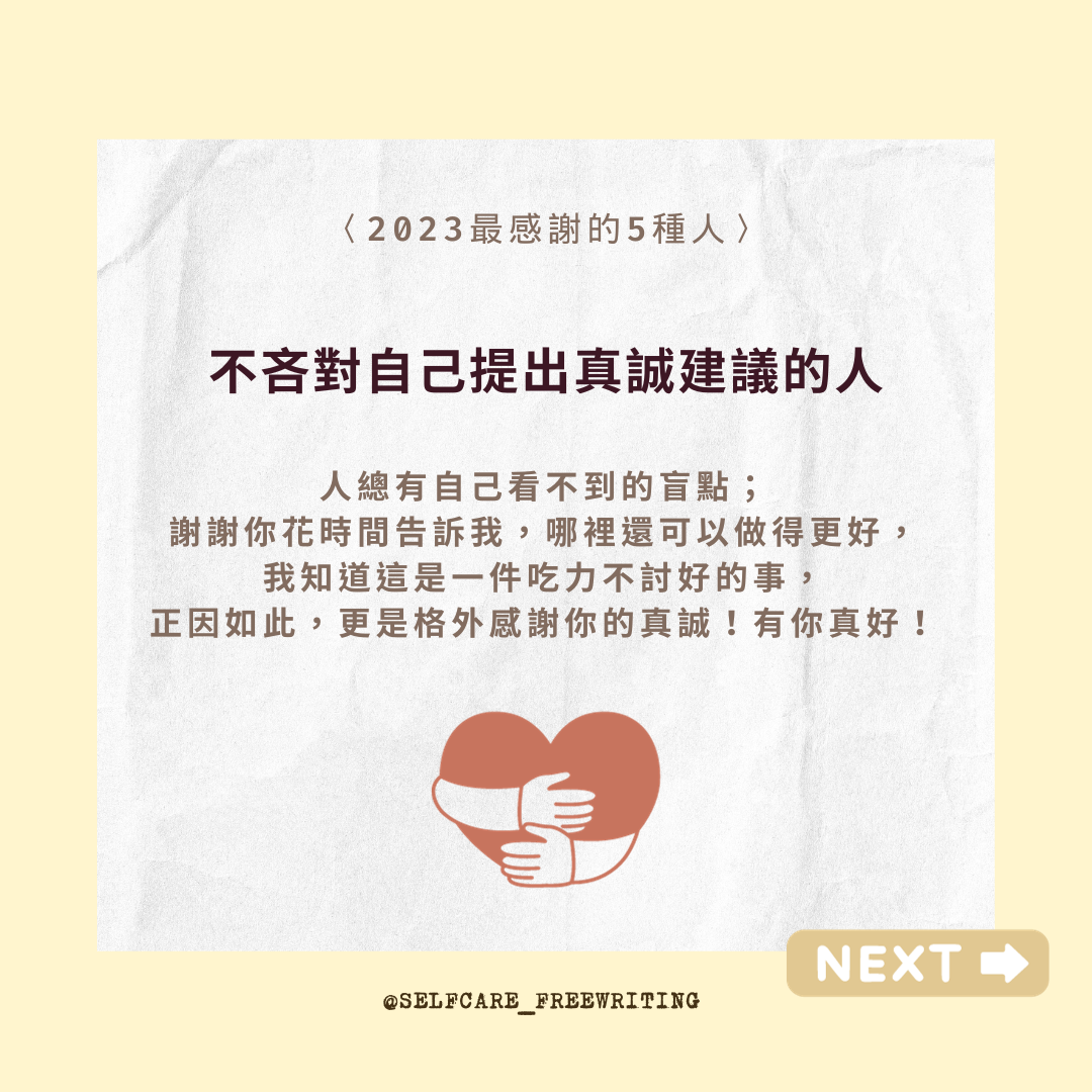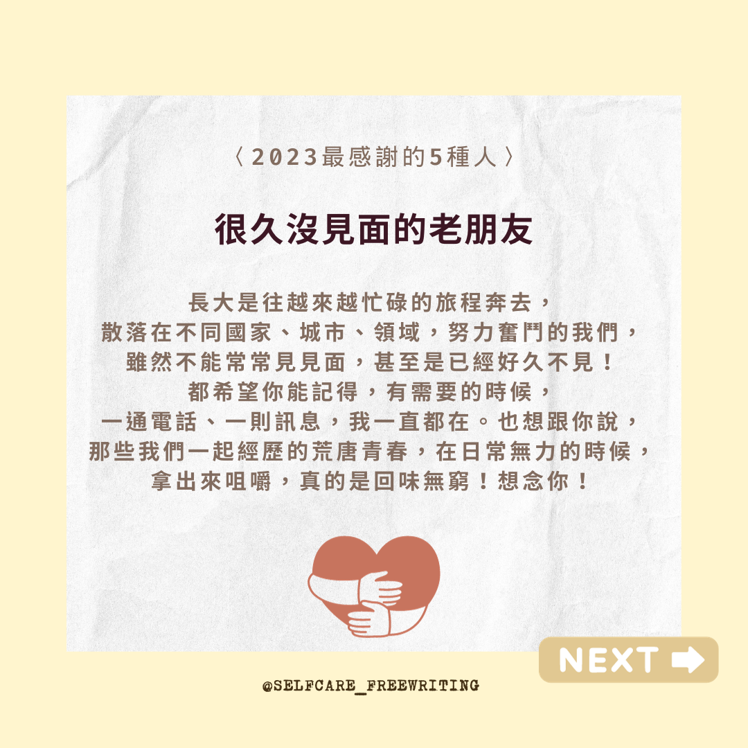 自我照顧方式 2023最感謝的5種人🍀 不好意思表達自己的感謝時,我會告訴對方:「有你真好。」 喜歡年末的其中一個理由,是能好好檢視、回顧這一年的所有。能夠感恩的時候,會感受到自己的豐盛與富足。不好意思表達自己的感謝時,我會告訴對方:「有你真好。」謝謝2023的這些人,陪我一起走過,龐大荒涼、但也遼闊無邊充滿可能性的人生旅程。