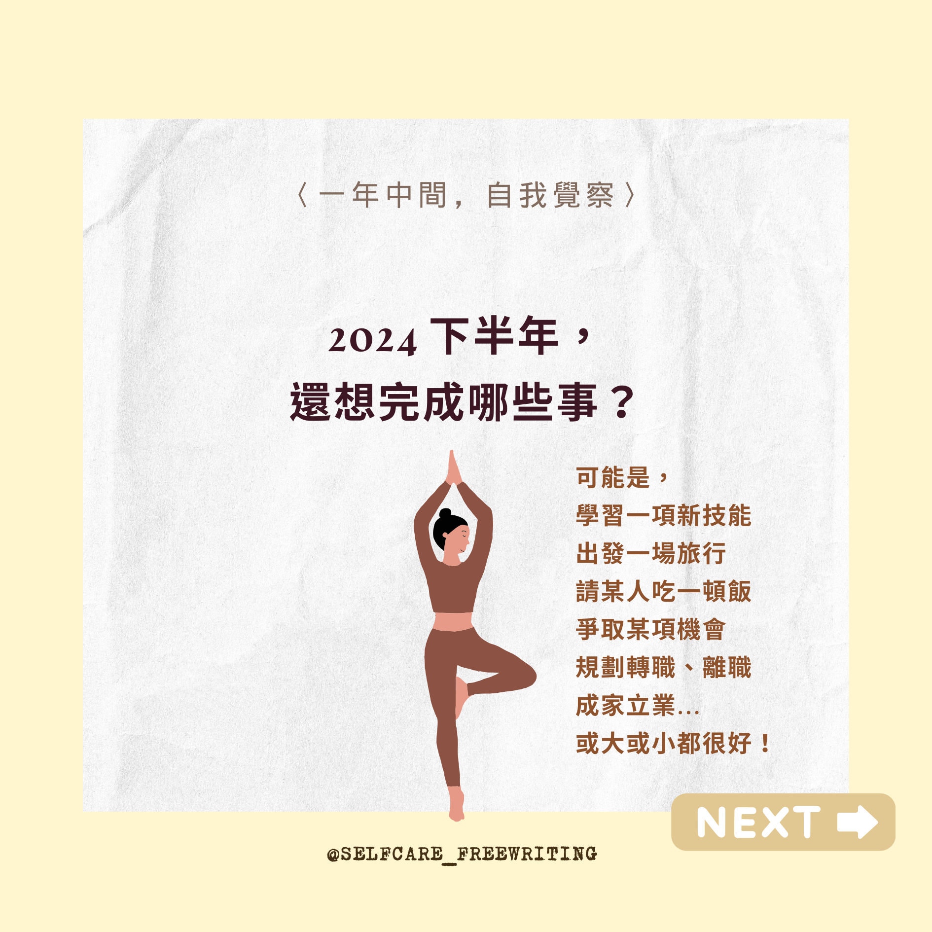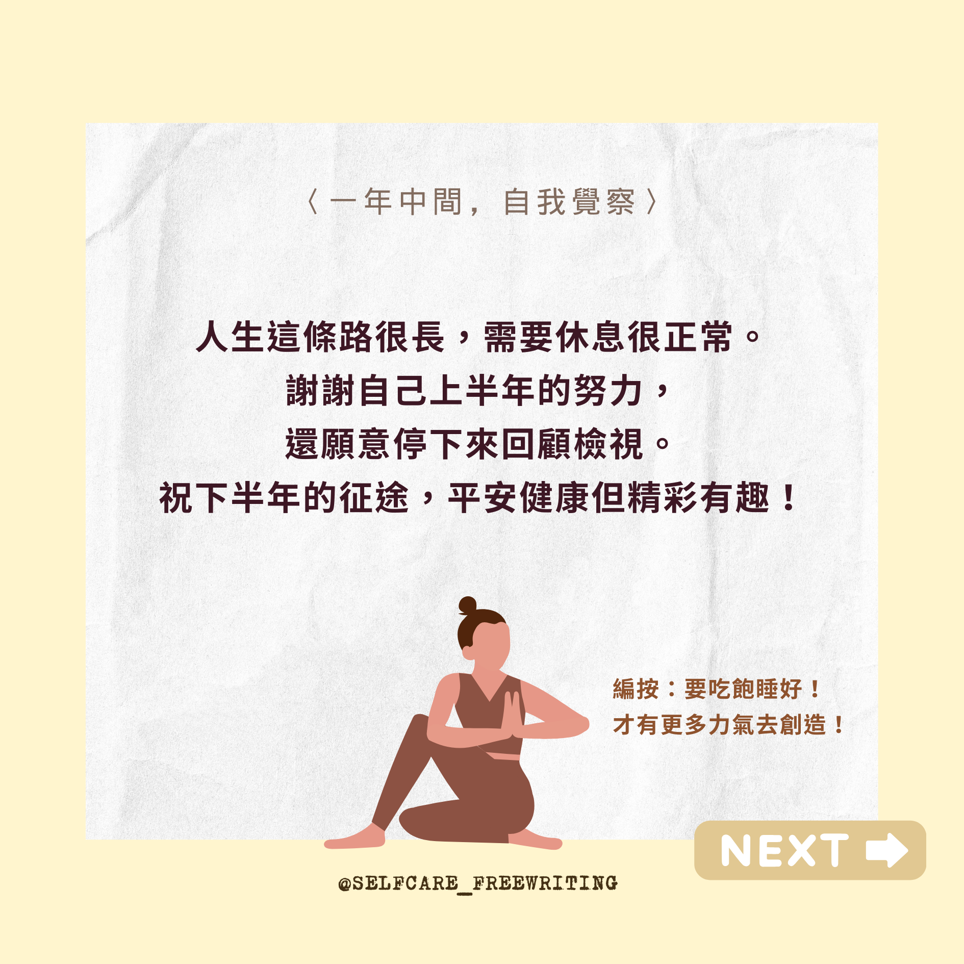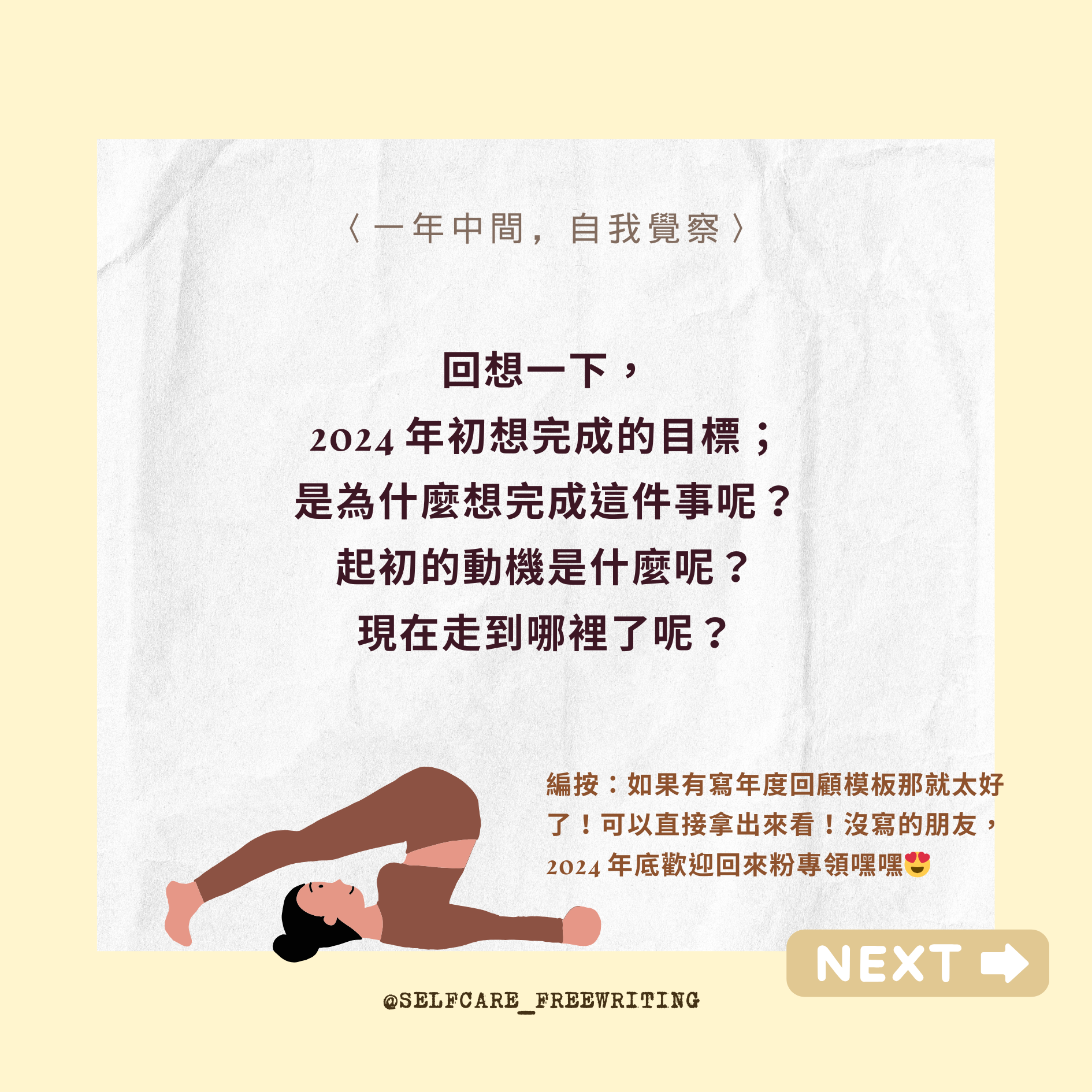 自我照顧方式 Self-Care 2024 mid-year RESET|一年中間,自我覺察✨ 隨時都能暫停、也隨時都可以再重新開始。從這五個問題裡,挑一個問問最近的自己吧。 2024 即將過半,相信你我他身上都有好多事情正在持續孵化、努力。但,如果有想刪除、修正、更改的目標,也是完全沒有問題的!而且人生這條路很長,需要休息也是很正常的哦🧘🏻#selfcare #2024 #年中回顧 #自我覺察 #療癒 #覆盤