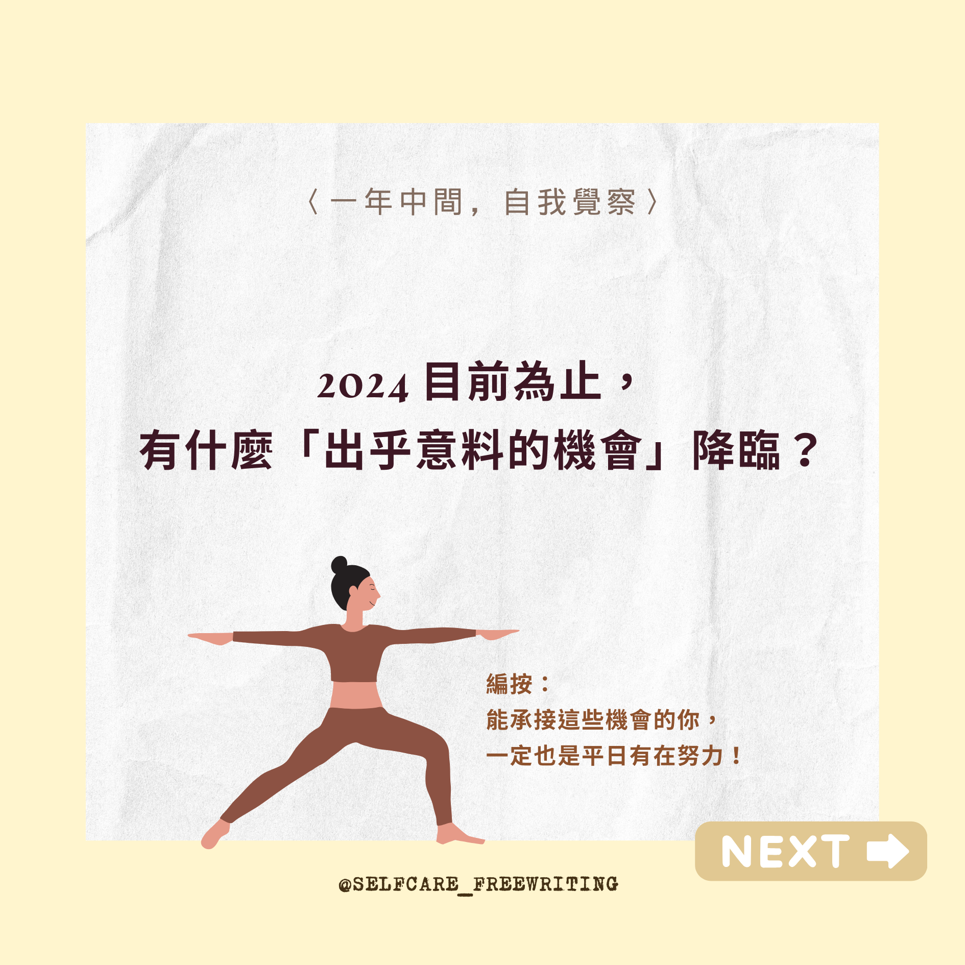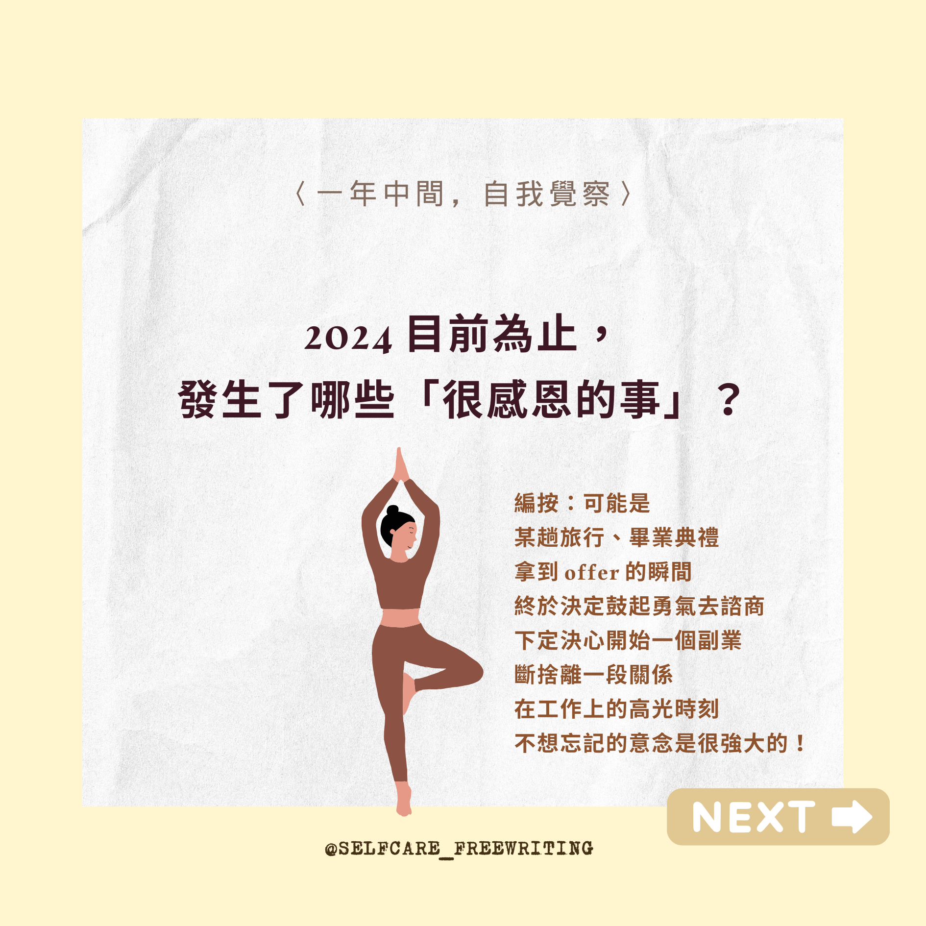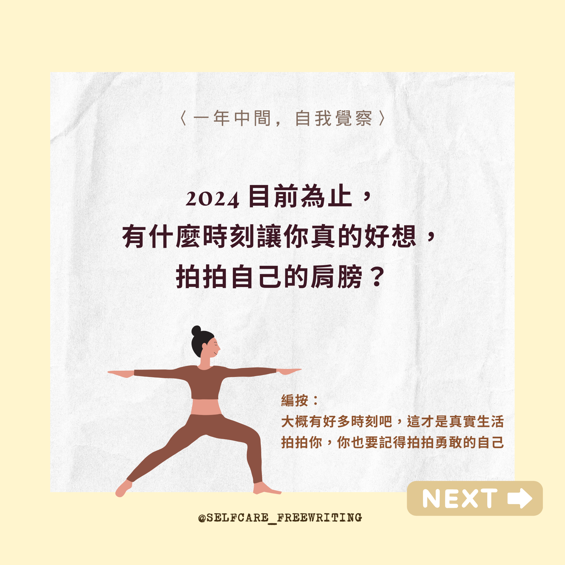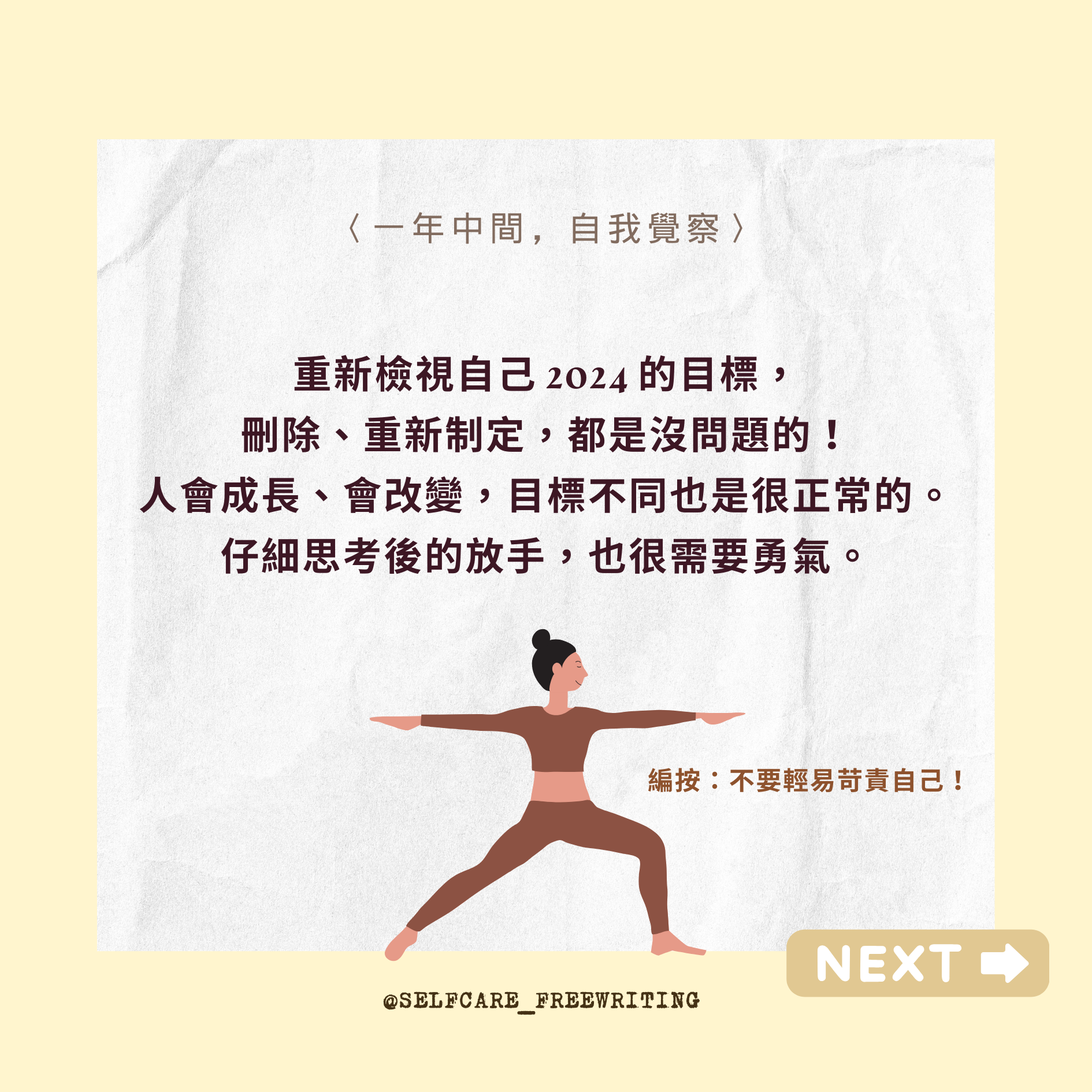 自我照顧方式 Self-Care 2024 mid-year RESET|一年中間,自我覺察✨ 隨時都能暫停、也隨時都可以再重新開始。從這五個問題裡,挑一個問問最近的自己吧。 2024 即將過半,相信你我他身上都有好多事情正在持續孵化、努力。但,如果有想刪除、修正、更改的目標,也是完全沒有問題的!而且人生這條路很長,需要休息也是很正常的哦🧘🏻#selfcare #2024 #年中回顧 #自我覺察 #療癒 #覆盤