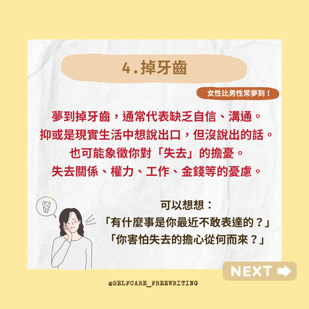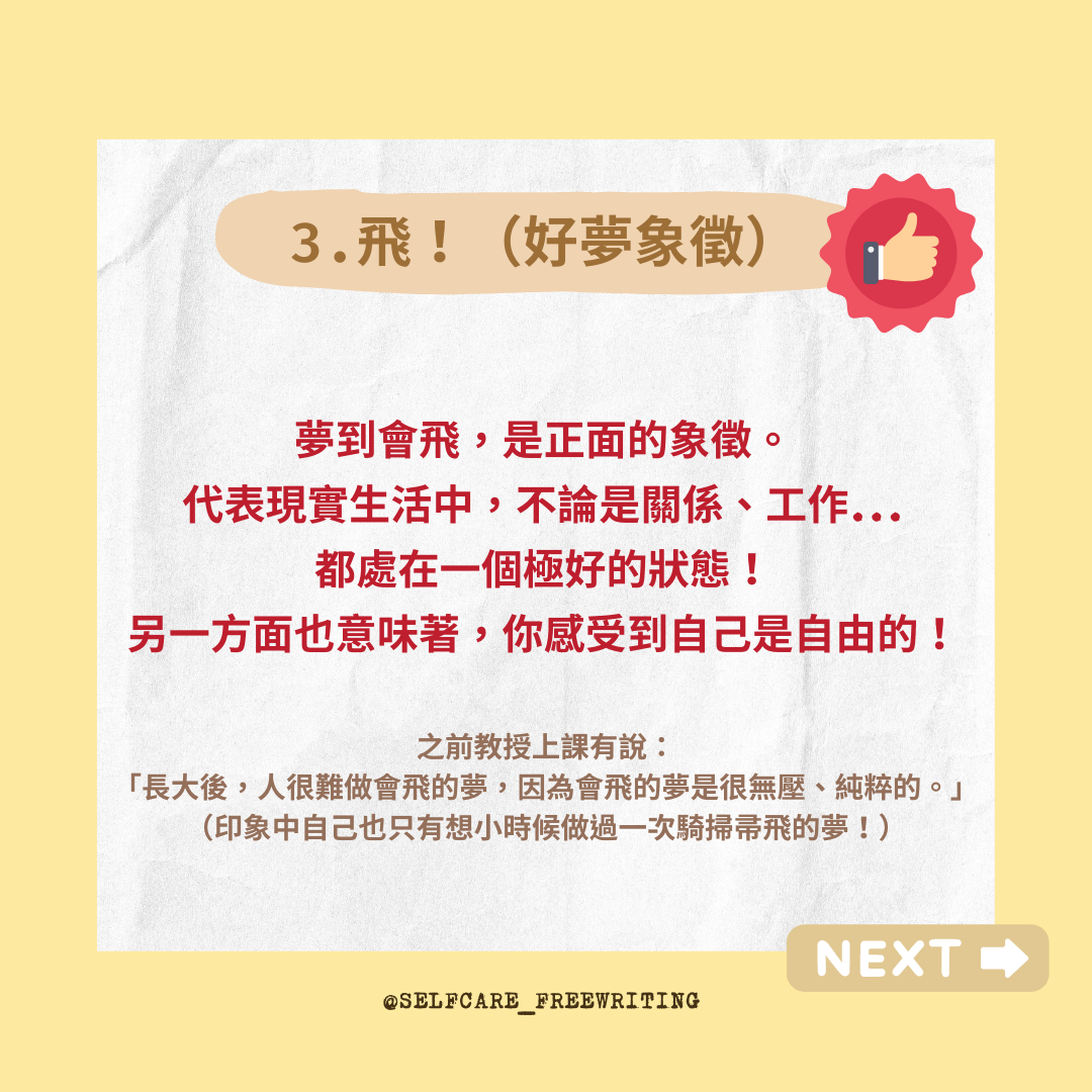 心理辭典 夢的寓意|十大常見夢境(上)💭 飛翔的夢是好夢還是惡夢?夢到掉牙怎麼辦?在夢裡常常在逃命?人類最常見的夢境,都象徵著什麼意思呢? 你是個常常做夢的人嗎?有仔細留意過醒來之後還記得的夢境,都是什麼樣子的內容呢?-飛翔的夢是好夢還是惡夢?夢到掉牙怎麼辦?在夢裡常常在逃命?人類最常見的夢境,都象徵著什麼意思呢?-想跟大家分享十個常見夢境的寓意;因為觀察自己的夢,也是了解最近生活狀態的好方法!