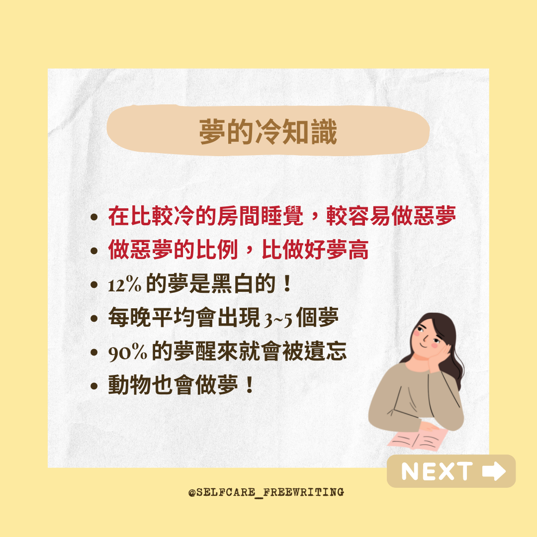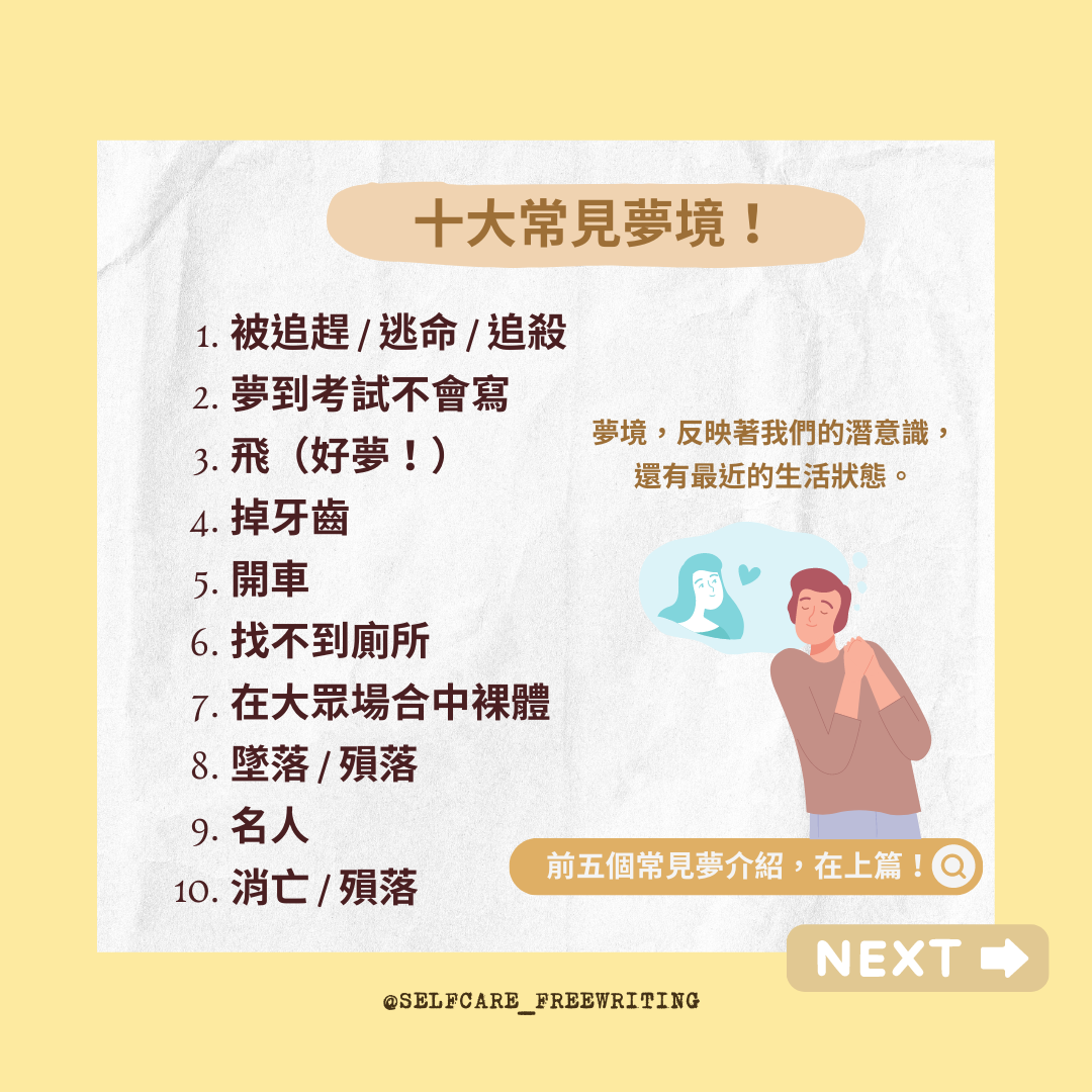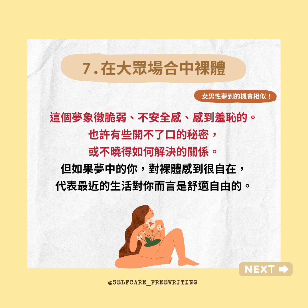 心理辭典 夢的寓意|十大常見夢境(下)💭 夢到在大眾面前裸體、夢到死亡又有什麼含義呢? 你知道在冷的地方睡覺比較熱的地方容易做惡夢嗎!夢到在大眾面前裸體、夢到死亡又有什麼含義呢?-這篇文要繼續跟大家分享十大常見夢境,透過觀察自己的夢了解自己內心深處的想法,覺察最近的狀態!