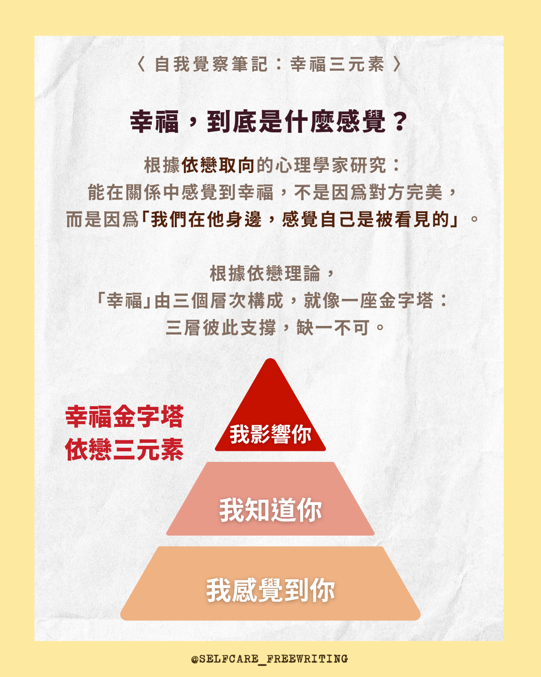 第三層象徵「成熟的連結&關係」 :我知道你會被我的行動影響,所以我更願意以溫柔與誠實對待這段關係。幸福金字塔頂端的「互動式調整」 ,是伴侶關係能長期穩定的關鍵。