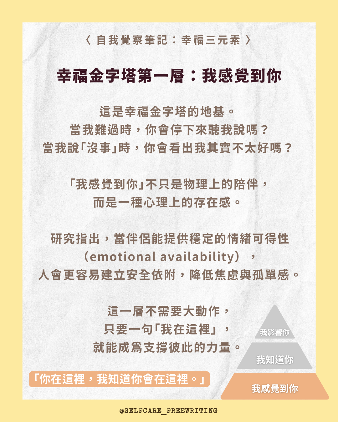 這是幸福金字塔的地基。當我難過時,你會停下來聽我說嗎?當我說「沒事」時,你會看出我其實不太好嗎?