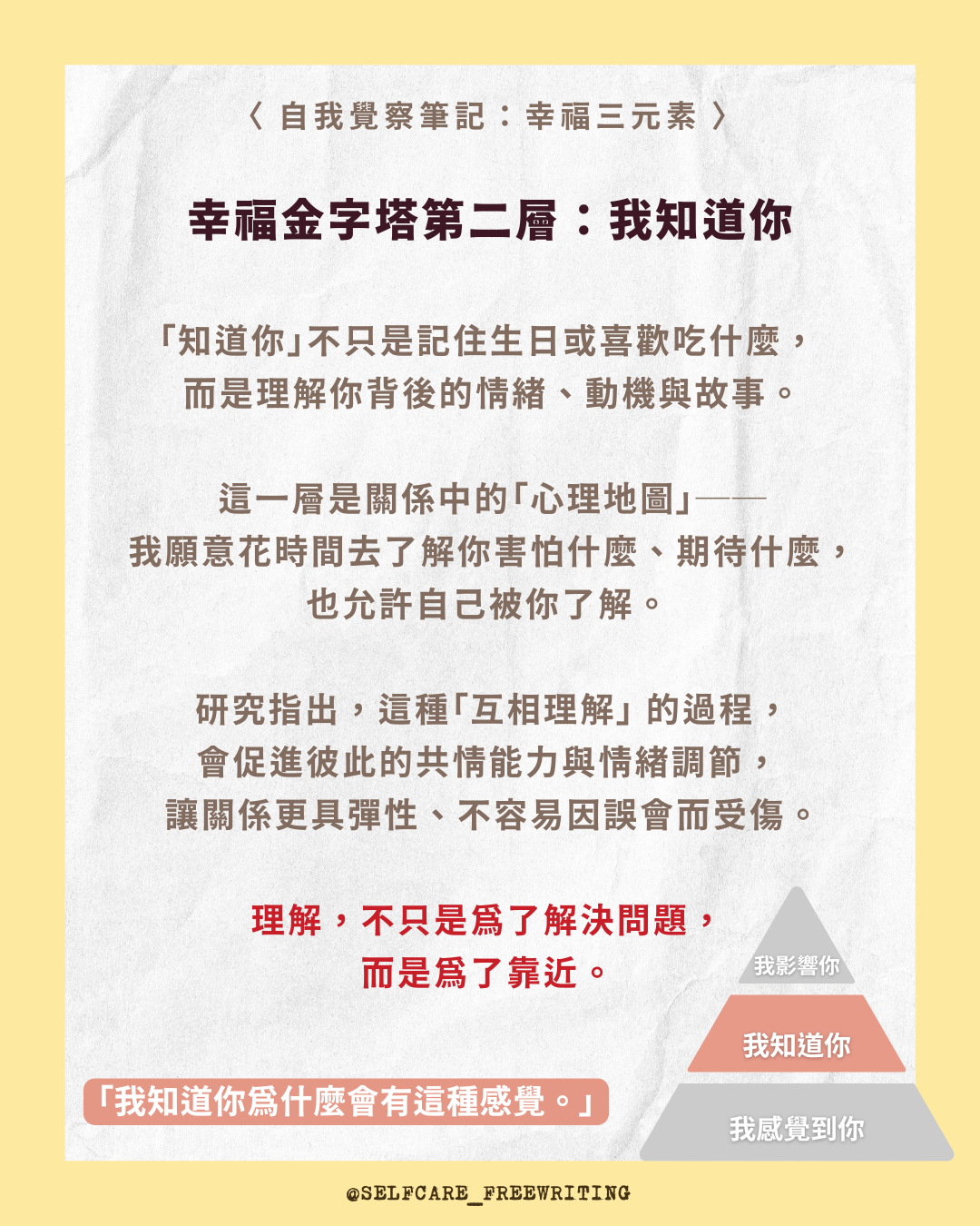 這一層是關係中的「心理地圖」──我願意花時間去了解你害怕什麼、期待什麼,也允許自己被你了解。