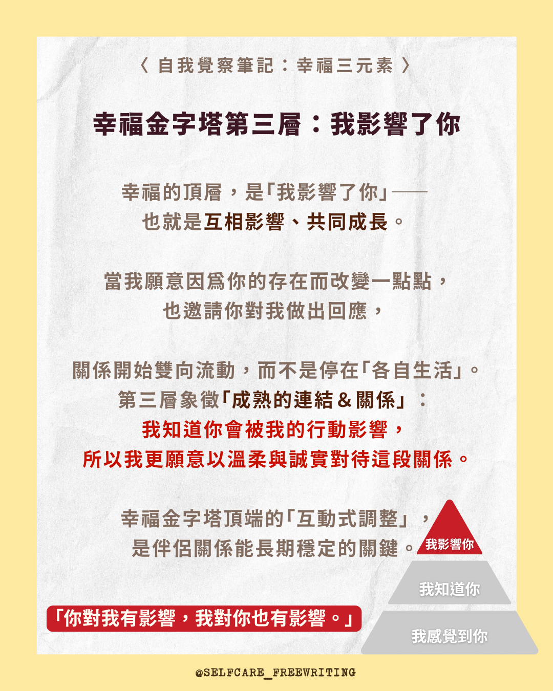 幸福的頂層,是「我影響了你」—也就是互相影響、共同成長。當我願意因為你的存在而改變一點點,也邀請你對我做出回應,關係開始雙向流動,而不是停在「各自生活」。