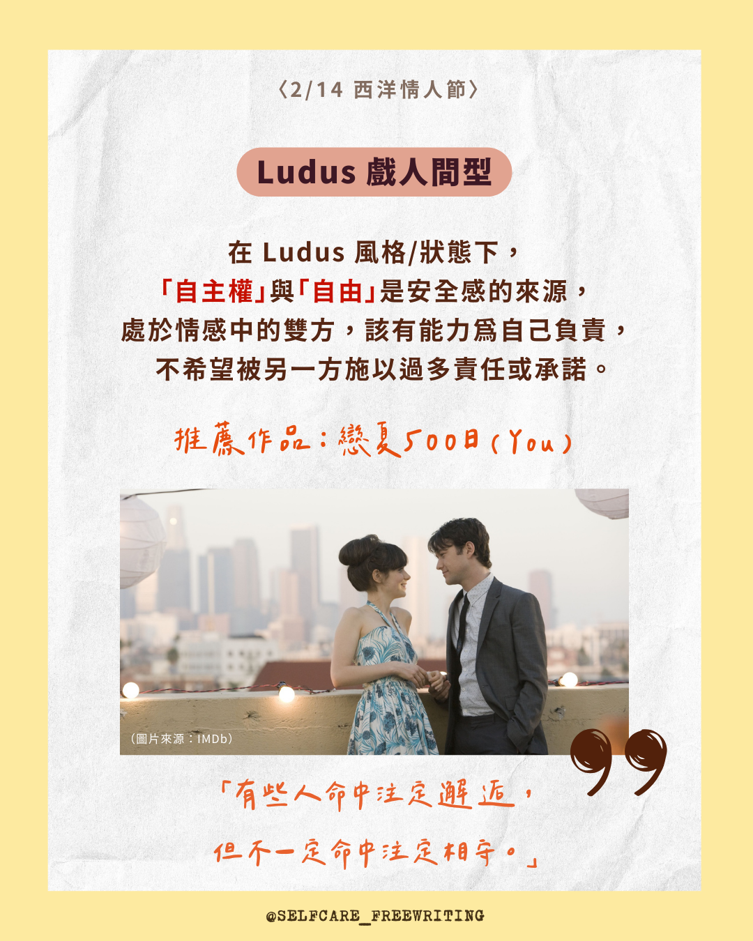 在 Ludus 風格/狀態下,「自主權」與「自由」是安全感的來源,處於情感中的雙方,該有能力為自己負責,不希望被另一方施以過多責任或承諾。