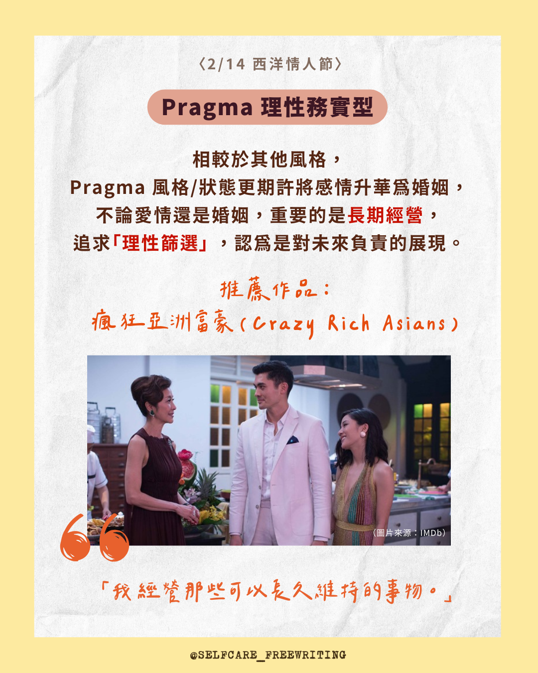 相較於其他風格,Pragma 風格/狀態更期許將感情升華為婚姻,不論愛情還是婚姻,重要的是長期經營,追求「理性篩選」 ,認為是對未來負責的展現。