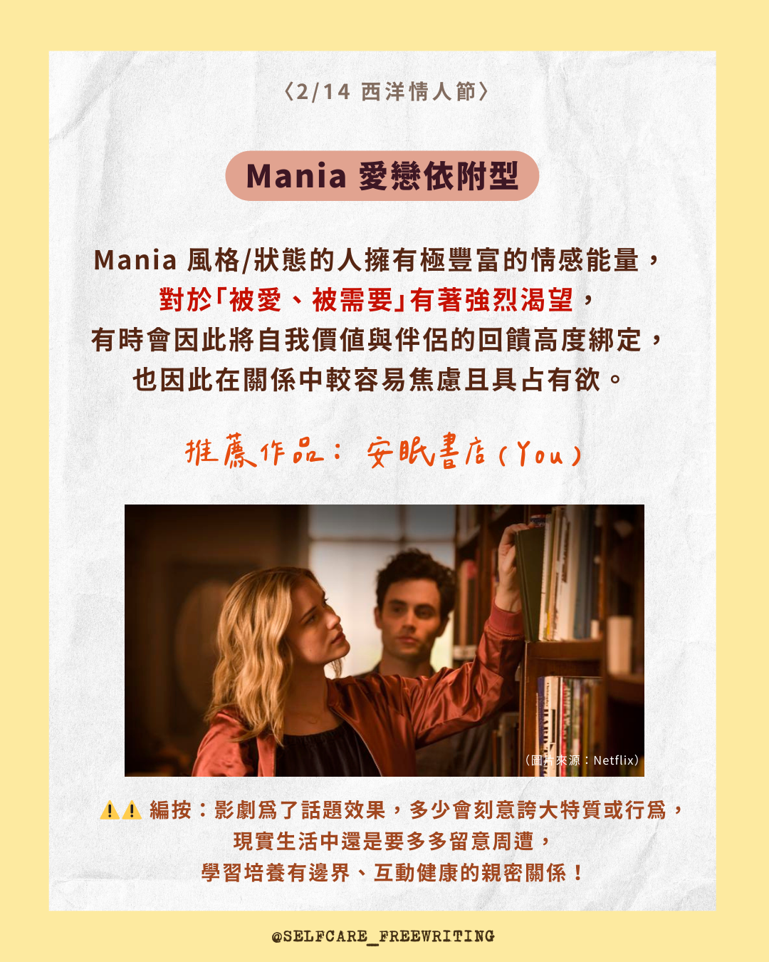 Mania 風格/狀態的人擁有極豐富的情感能量,對於「被愛、被需要」有著強烈渴望,有時會因此將自我價值與伴侶的回饋高度綁定,也因此在關係中較容易焦慮且具占有欲。