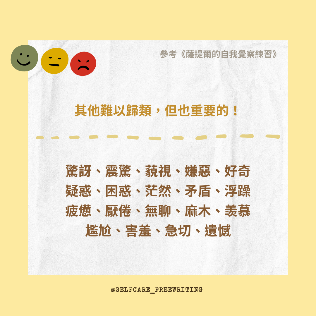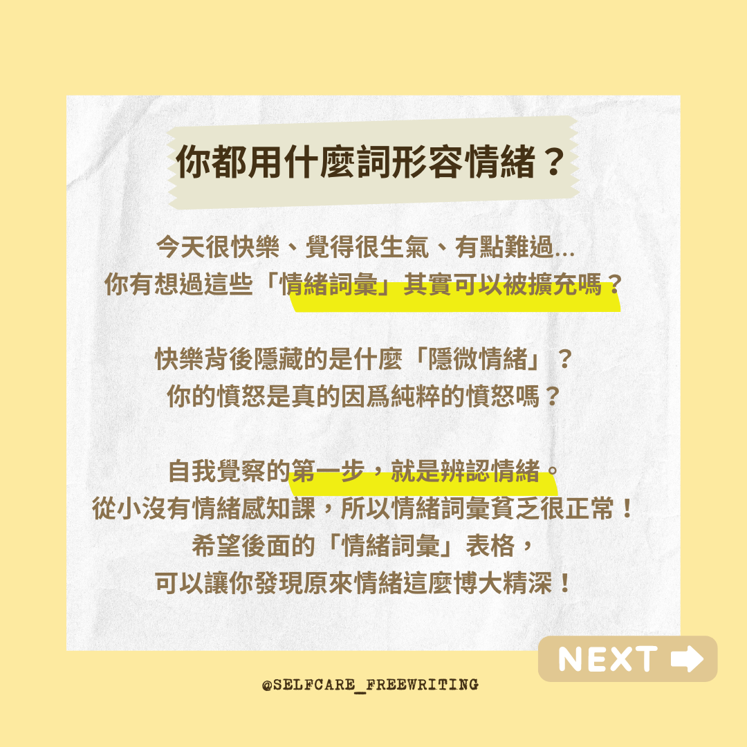 心理辭典 Mood Words|擴充你的情緒詞彙🎨 生氣不一定只是生氣,可能是對自己失望;難過不一定只是難過,可能是覺得被辜負。 情緒由諸多細膩感受組合而成,我常常覺得自己要「更詞達意」一些;也常聽到某些朋友說,對於情緒好像沒什麼感覺。其實不是我們沒感覺,只是我們很少被教導怎麼形容自己的感受。最近很喜歡一句話:「一切都跟感受有關。」自我覺察的第一步是去覺察感受,希望這127個「情緒詞彙」能幫助你更了解自己的感覺!