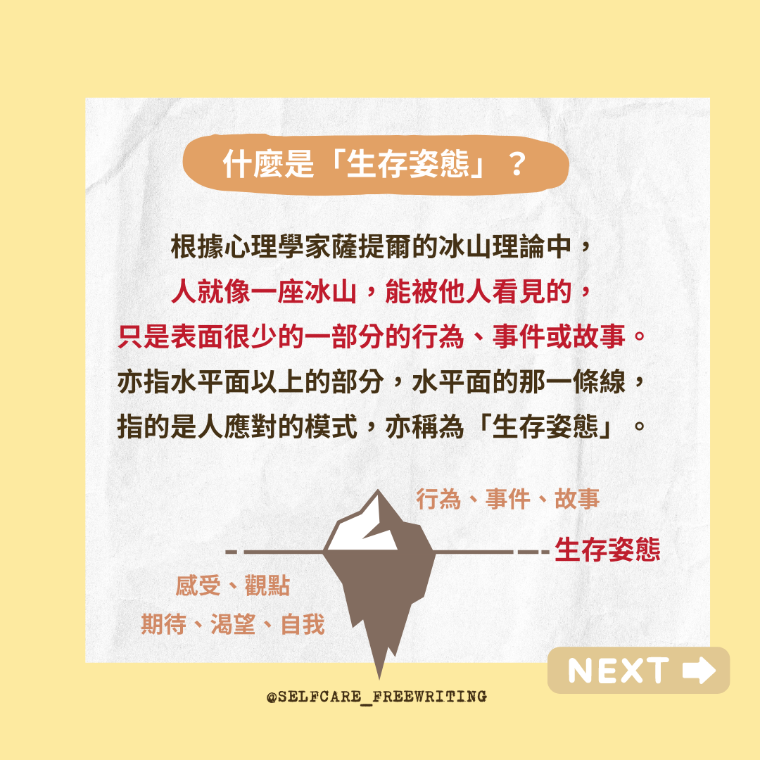 心理辭典 薩提爾的冰山理論|認識你的「生存姿態」❤️🩹 你溝通時,有辦法表達真正的自己嗎? 你有好好尊重「關注自己&別人&外在」的需求嗎?真正能人讓感到富足的,不是手機裡、網路上排山倒海的資訊;而是和現實生活中人、事、物的深刻連結。
