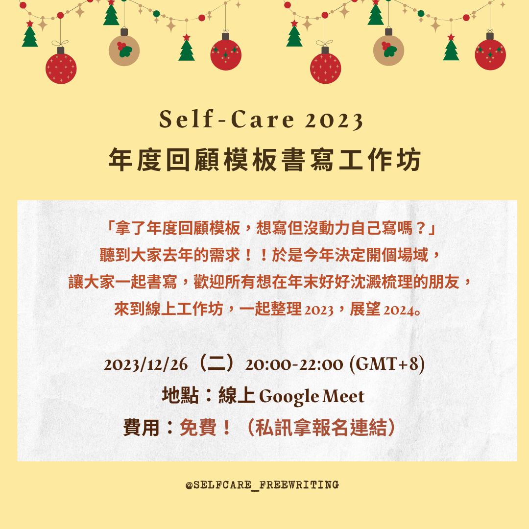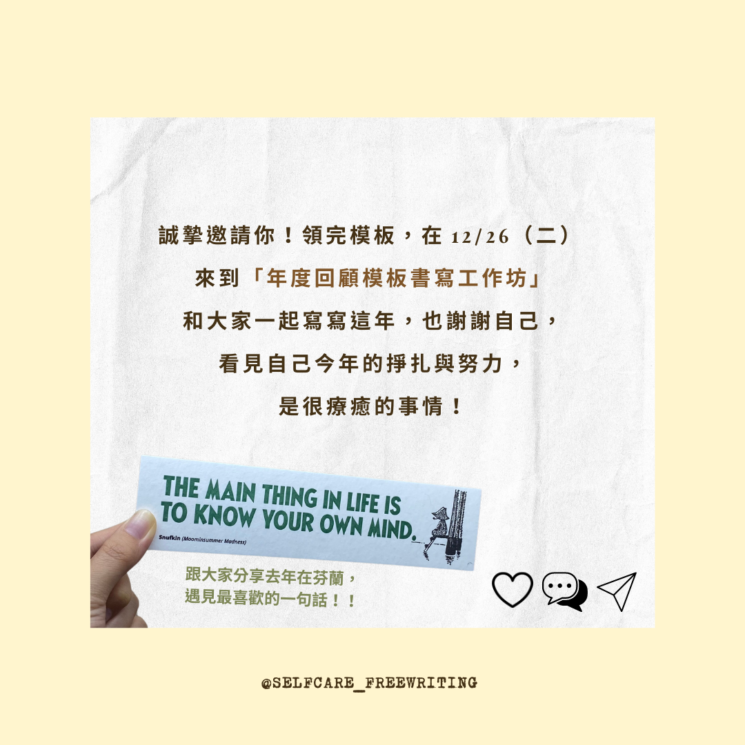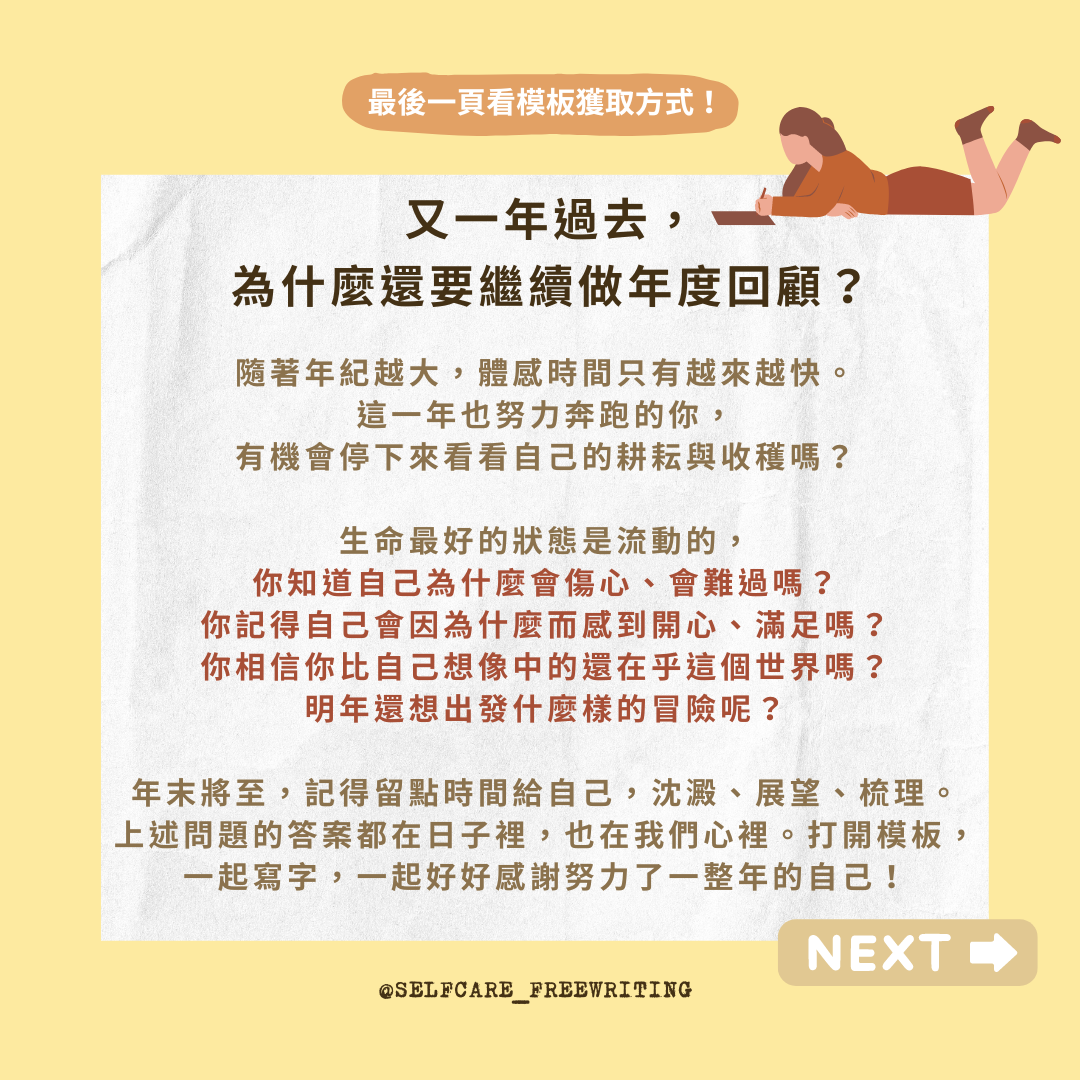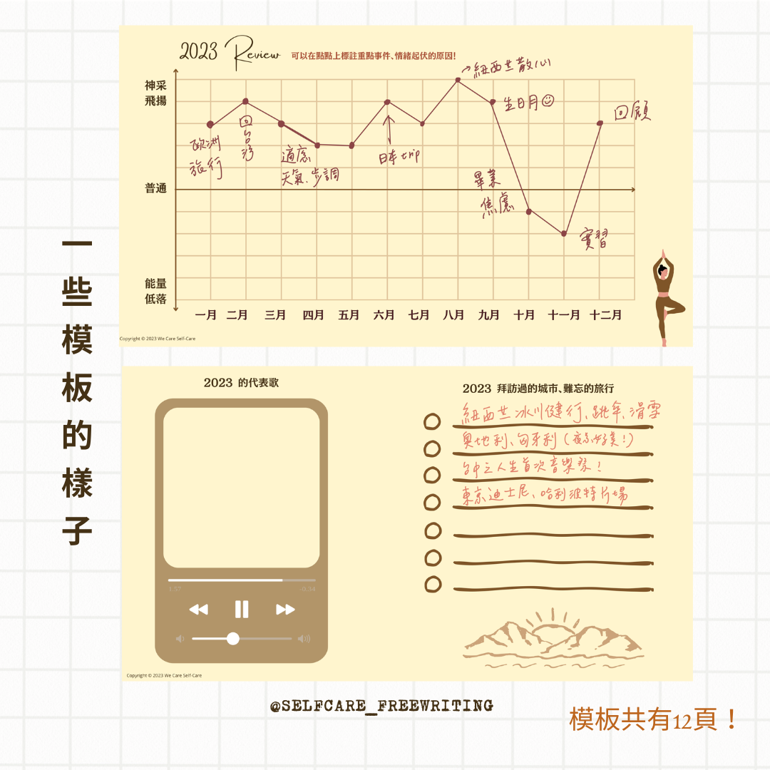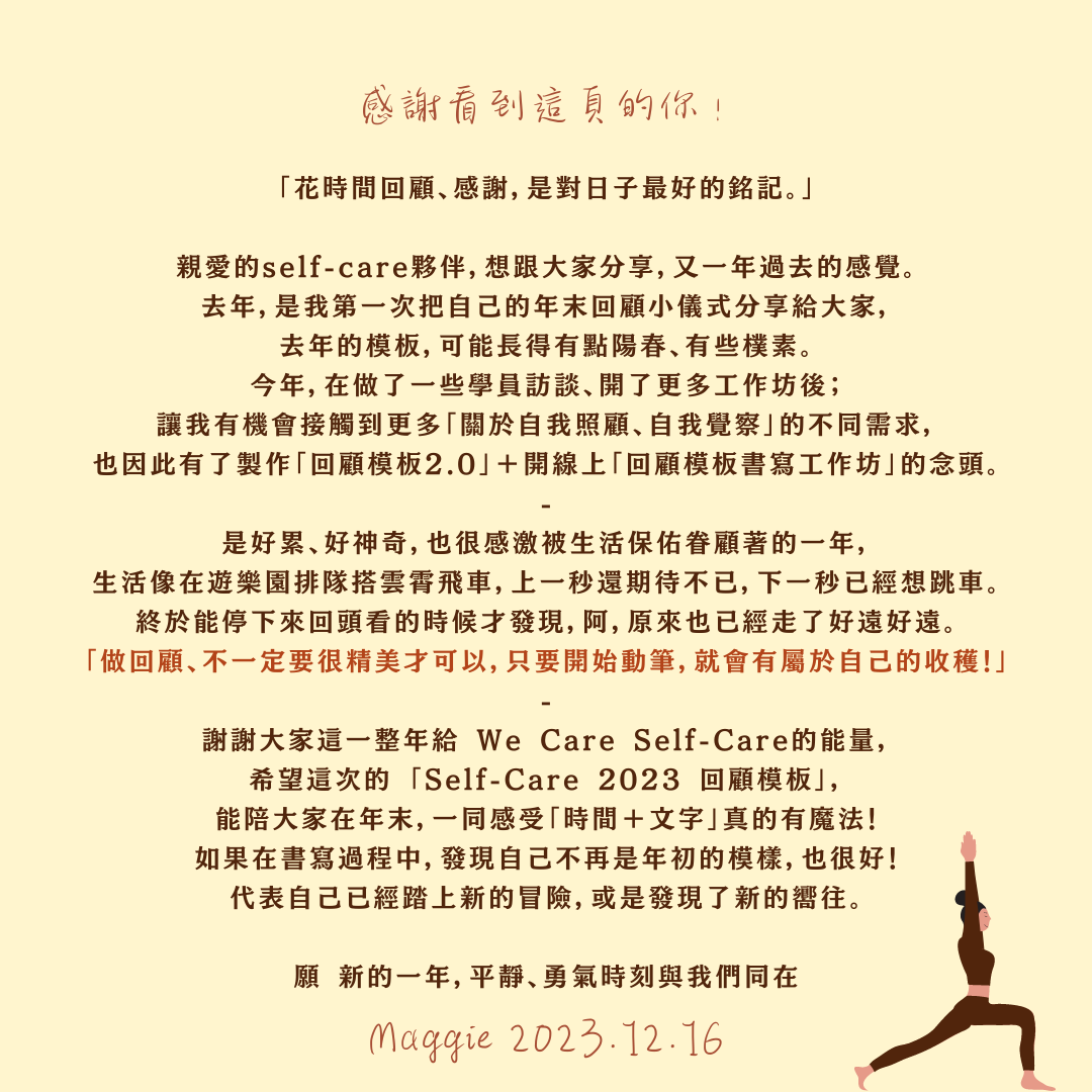 希望這次的 「Self-Care #2023回顧模板」,能陪大家在年末,找到一些內在本有的能量,一同感受「時間+文字」真的有魔法!如果在書寫過程中,發現自己不再是年初的模樣,也很好!代表自己已經踏上新的冒險,或是發現了新的嚮往。