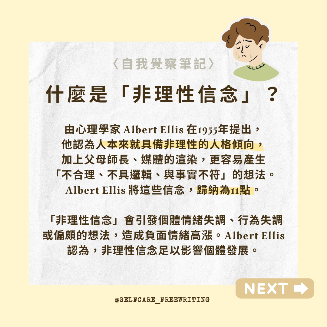 心理學家Ellis歸納出人們心中常出現的「11條非理性信念」,爾這些信念會大大影響我們的情緒與日常作息。非理性的概念之前修人格心理學的時候,便淺淺的留在腦中:明白身為人類,多數時我們都是 #非理性的 。