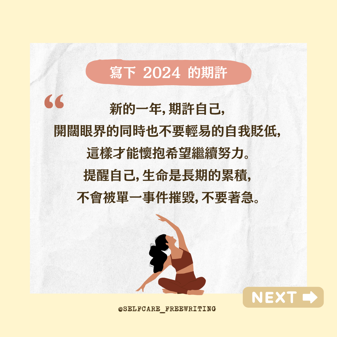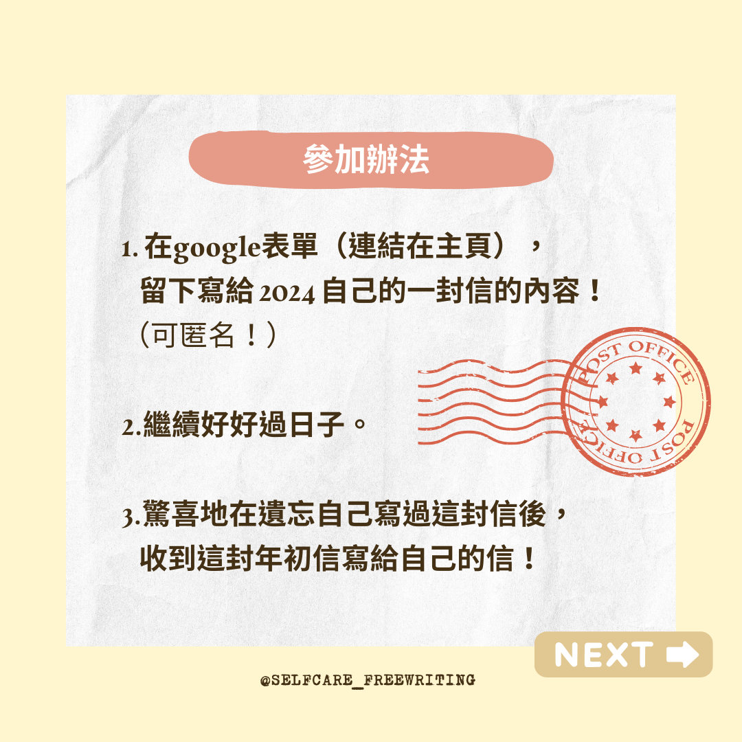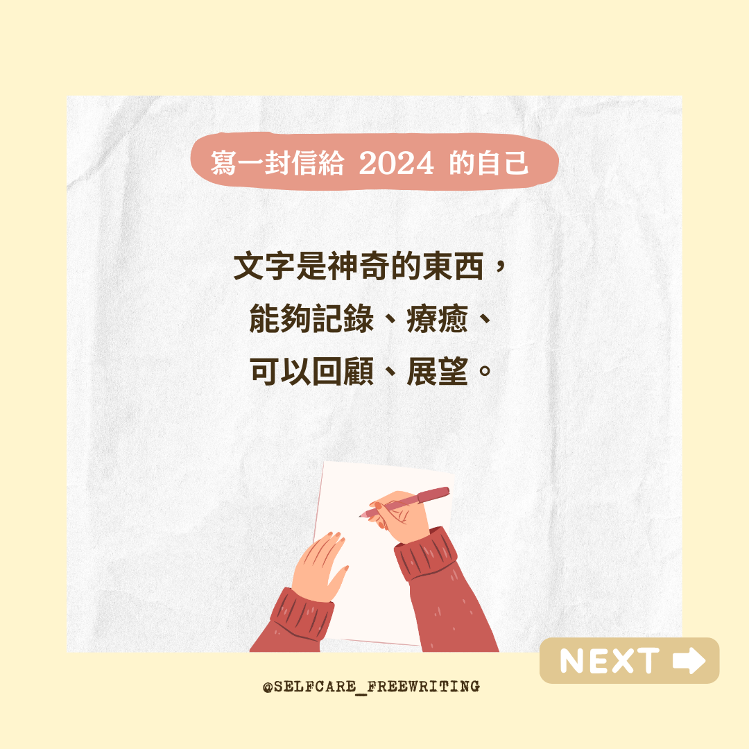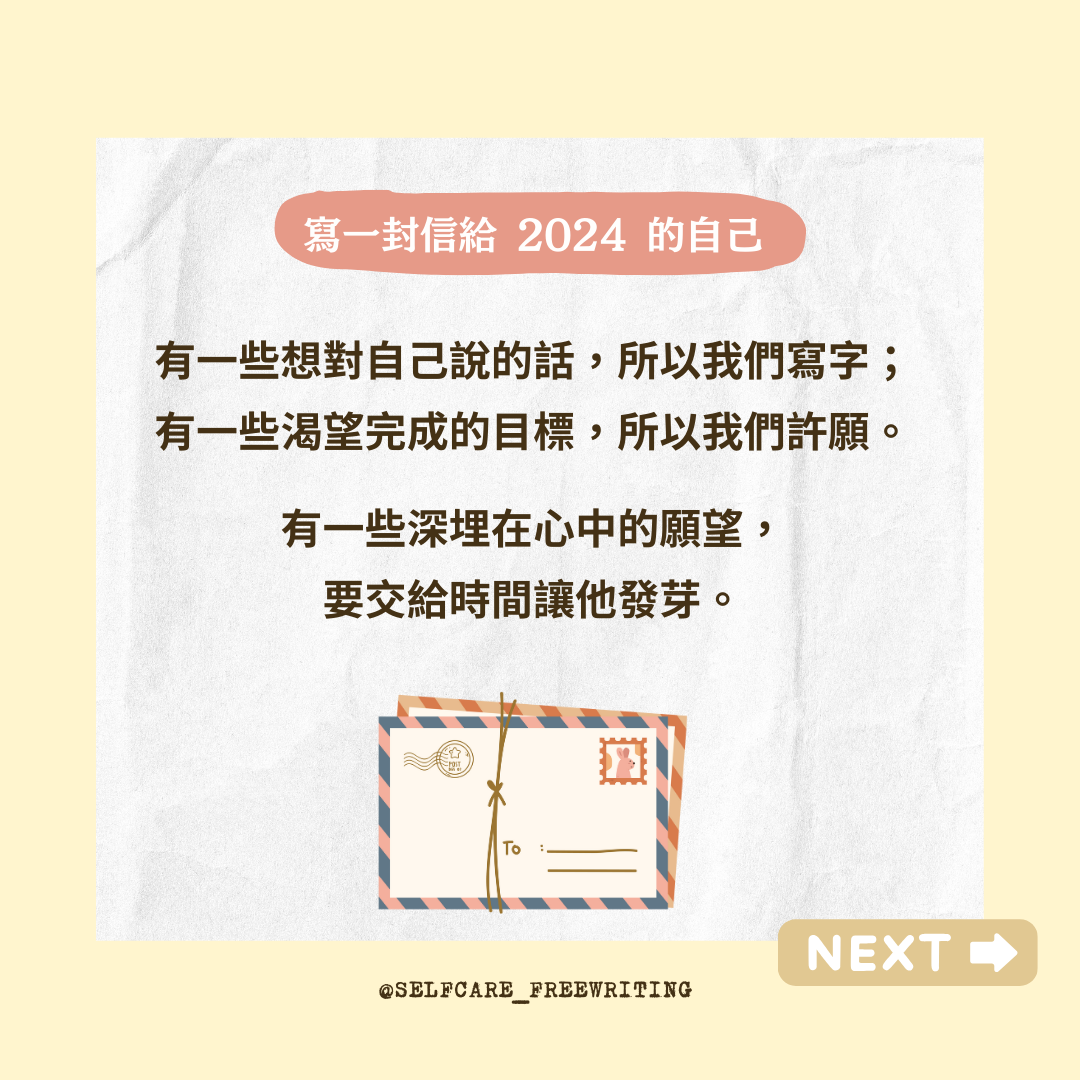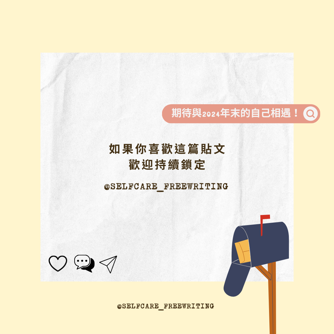 文字是好神奇的東西,可以記錄、可以療癒、可以回顧、可以展望。2024 的一開始,邀請也有話想對自己說的你,寫一封信給 2024 年末的自己;埋下一顆心願的時光膠囊,交給 @selfcare_freewriting,在年末/年中寄回給你!