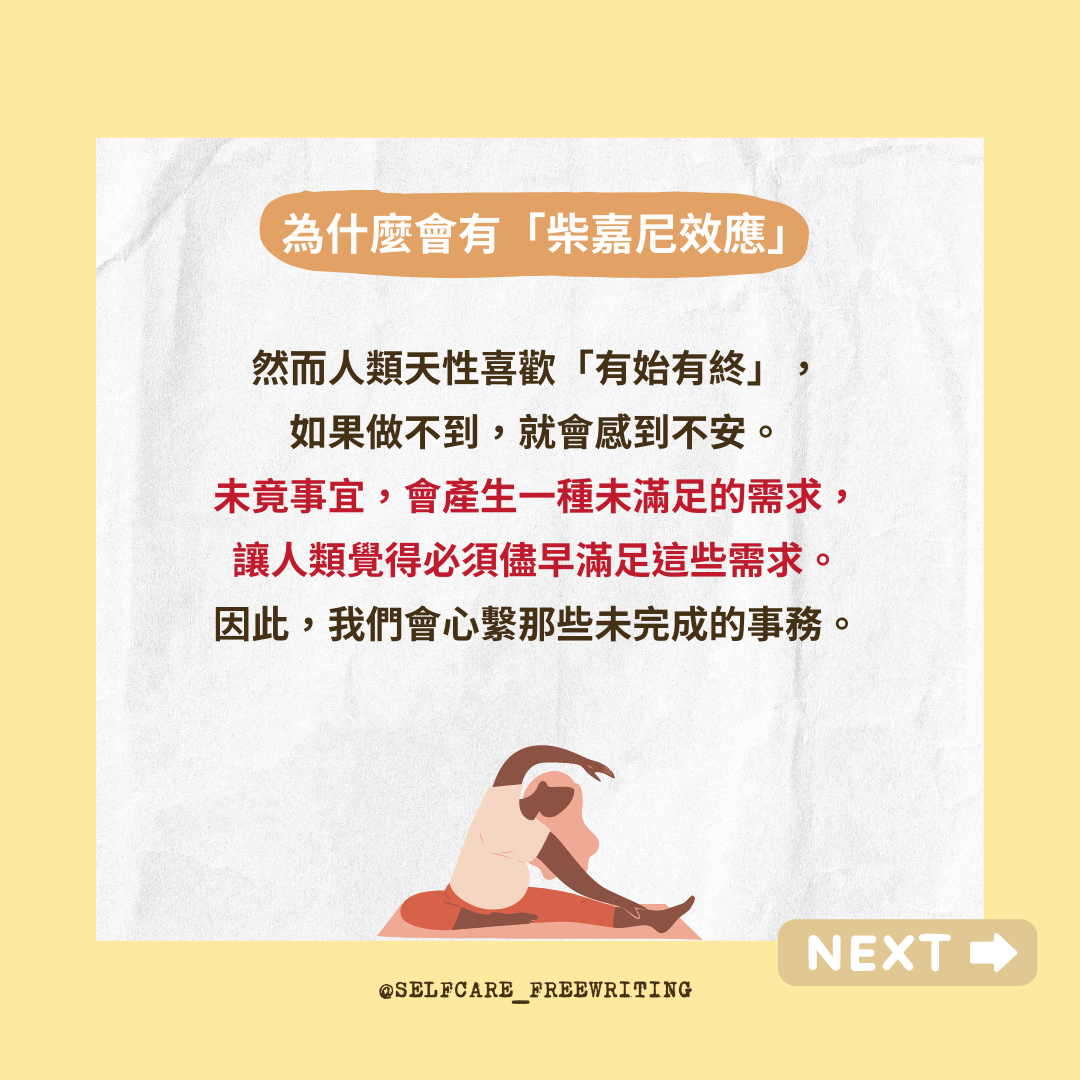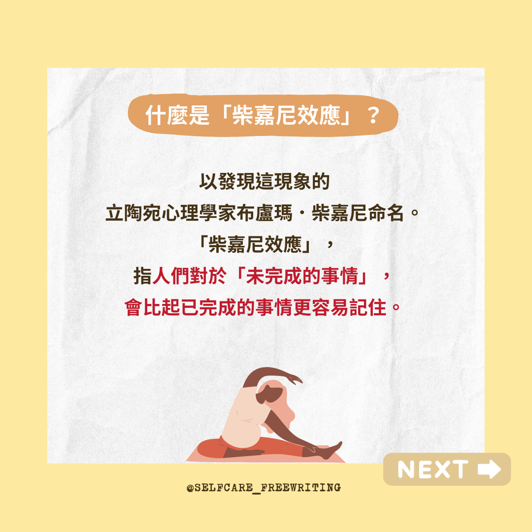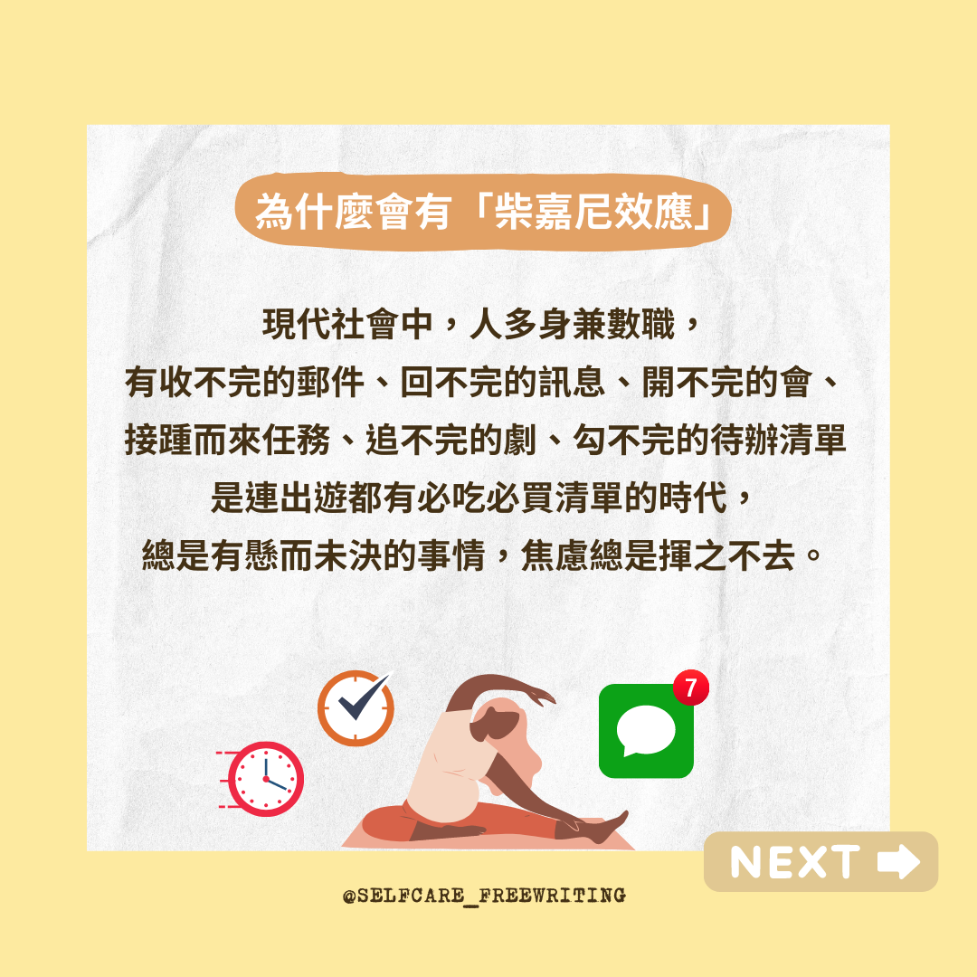 心理辭典 柴嘉尼效應|如何擺脫未完成的焦慮感😶🌫️ 人常常會對還沒完成的事念念不忘,甚至常常忘記自己已經完成的事情。 是什麼讓那些「未竟事宜」一直困擾著我們呢?又是什麼讓「拖延」的習慣一直揮之不去呢?